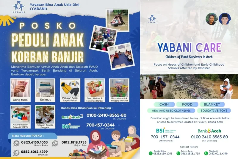 Banda Aceh – Upaya pemulihan pascabencana bagi anak-anak terdampak banjir di Aceh terus mendapatkan dukungan dari berbagai pihak. Yayasan Bina Anak Usia Dini (YABANI) menjadi salah satu lembaga yang bergerak cepat dengan menggalang serta menyalurkan bantuan, dengan fokus utama pada pendidikan dan kesehatan anak usia dini.